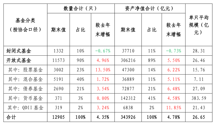 注:表中“封闭式基金”包含申报为封闭运作和定期开放的基金。由于四舍五入原因,可能存在分项之和不等于合计的情形;基金数量统计不含已向证监会报送清盘的基金
